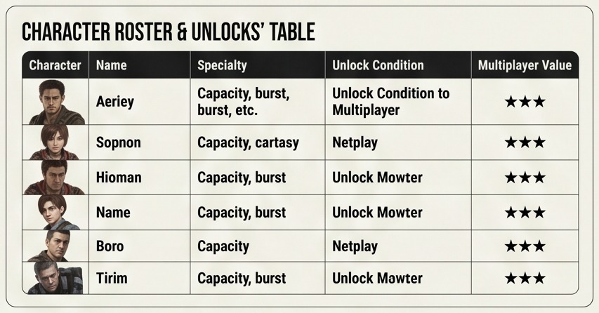 Chris + Jill are available by default. The rest of the roster is earned through Classic/Rebirth/Master of Knifing and Wireless Play clears.
